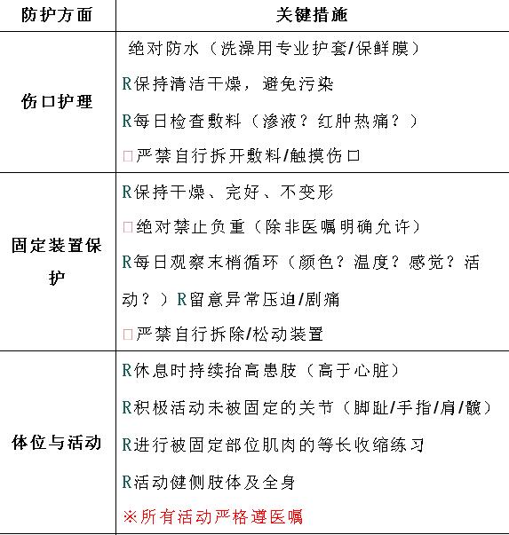 骨折術(shù)后拆線前的階段(通常為術(shù)后7-14天)是傷口愈合和早期穩(wěn)定的關(guān)鍵時期,特別是未拆線出院的患者做好自我防護(hù)至關(guān)重要,能有效預(yù)防感染、促進(jìn)愈合、避免并發(fā)癥。以下是詳細(xì)的自我防護(hù)清單: