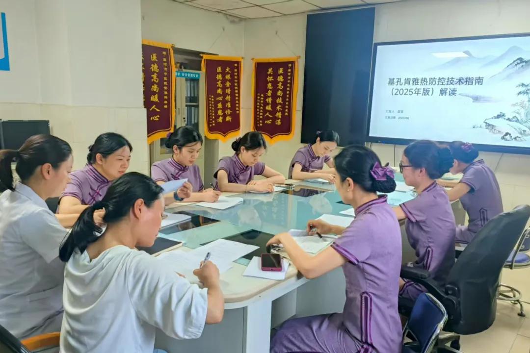 培訓中,趙瑩從多個維度對基孔肯雅熱進行了詳細講解:了解該疾病的病原學特征、流行病學特點、臨床表現(xiàn)和診斷標準,重點強調(diào)了通過白紋伊蚊、埃及伊蚊叮咬傳播的途徑,以及發(fā)熱、關節(jié)痛和皮疹等典型癥狀的識別要點。并系統(tǒng)培訓了針對發(fā)熱患者的預檢分診流程、疑似病例的規(guī)范處置方法以及職業(yè)防護措施,確保每位工作人員都能熟練掌握。