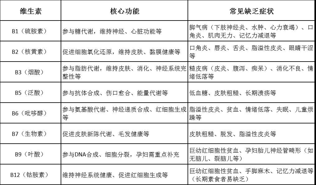 一、各類B族維生素的核心功能與缺乏癥狀