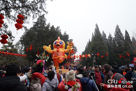 2017年1月28日,北京第三十二屆地壇春節(jié)文化廟會(huì)開幕。廟會(huì)吉祥物“金雞欣欣”賣萌亮相引圍拍。韓基韜 攝
