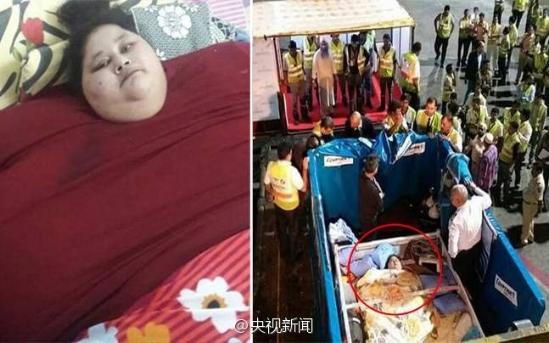 2月11日凌晨,體重高達(dá)500公斤的埃及婦女伊曼•阿邁德,乘飛機(jī)抵達(dá)印度孟買進(jìn)行減肥手術(shù)。伊曼今年36歲,已有25年沒(méi)有走出過(guò)屋子。航空公司為她特別改造了機(jī)艙,她下機(jī)也是通過(guò)起重機(jī)把她以及她躺臥的床一起從飛機(jī)上起吊到貨車上送往醫(yī)院。(央視記者程煒) ????圖片來(lái)源:中央電視臺(tái)新聞中心官方微博
