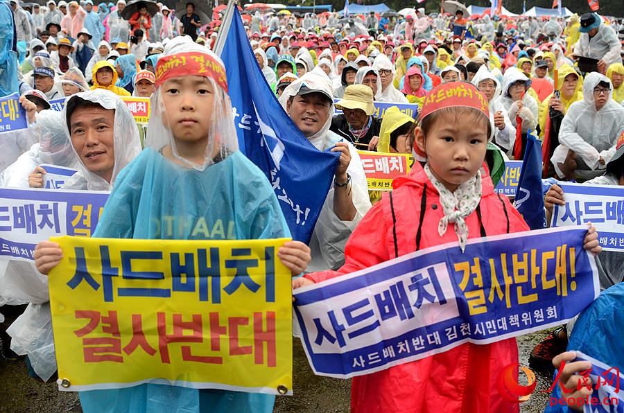 當天下午,首爾下起瓢潑大雨,但這并未阻擋韓國民眾抗議“薩德”部署的腳步。據(jù)活動主辦方“8·15全國民和平行動促進委員會”估計,當天下午約有一萬人參加了反“薩德”集會。學生、勞動者、農(nóng)民等多個市民團體通過演講、歌舞表演等多種形式,共同呼吁當局立即暫停部署“薩德”系統(tǒng)。