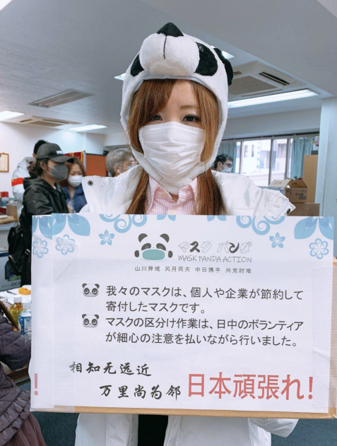 此次免費(fèi)發(fā)放口罩的活動——“口罩熊貓行動”,是由中日志愿者協(xié)會、日本湖南人會、在日華僑華人及企業(yè)共同發(fā)起。在統(tǒng)一的制服上、裝口罩的紙箱上寫著“來自武漢的報恩”“日本加油!”“相知無遠(yuǎn)近,萬里尚為鄰”等標(biāo)語。