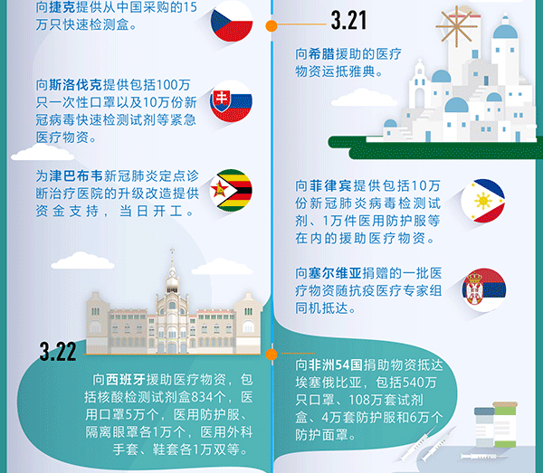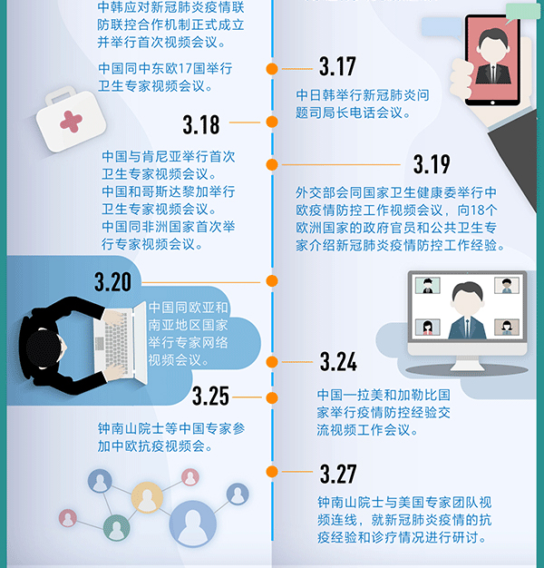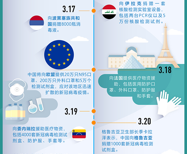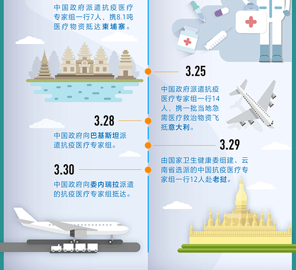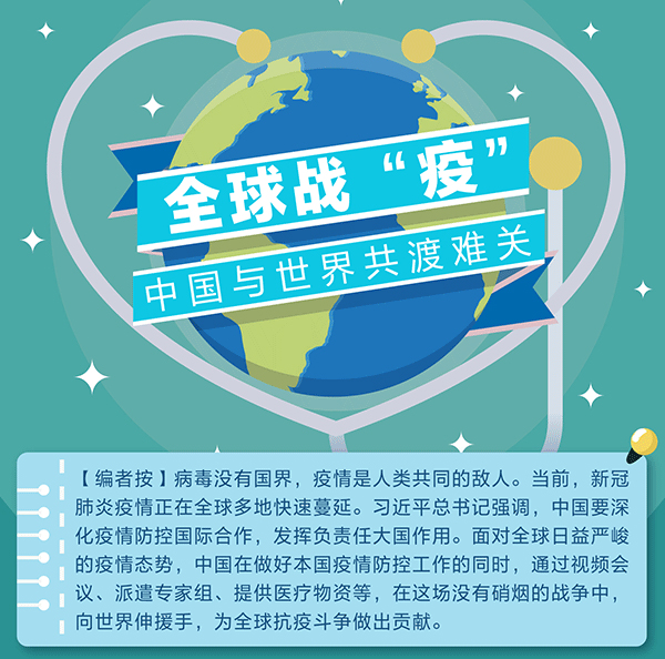 【編者按】病毒沒有國界,疫情是人類共同的敵人。當(dāng)前,新冠肺炎疫情正在全球多地快速蔓延。習(xí)近平總書記強調(diào),中國要深化疫情防控國際合作,發(fā)揮負(fù)責(zé)任大國作用。面對全球日益嚴(yán)峻的疫情態(tài)勢,中國在做好本國疫情防控工作的同時,通過視頻會議、派遣專家組、提供醫(yī)療物資等,在這場沒有硝煙的戰(zhàn)爭中,向世界伸援手,為全球抗疫斗爭做出貢獻(xiàn)。