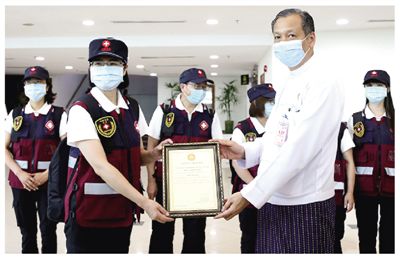 4月22日,在緬甸仰光國際機場,緬甸衛(wèi)生和體育部醫(yī)學研究司司長佐丹吞(前右)向中國抗疫醫(yī)療專家組頒發(fā)證書。 |