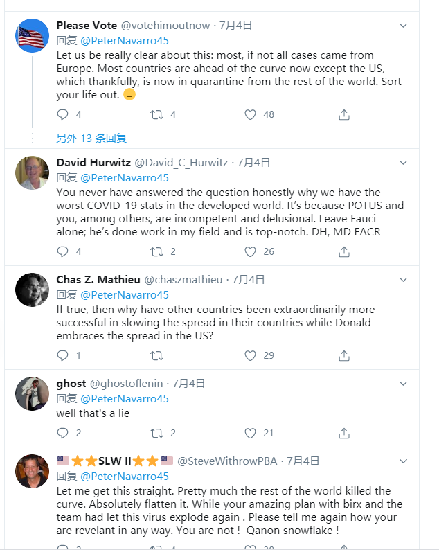 對于美國政客炒冷飯的劇情,觀眾早就不耐煩了??纯醇{瓦羅親自轉(zhuǎn)發(fā)的推特下收到的一排排留言:“讓我們弄弄清楚:多數(shù)的病例來自歐洲。多數(shù)國家都跑贏了增長曲線,除了美國?,F(xiàn)在美國被全世界隔離。先整理好你自己的生活吧。”