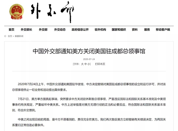 美方無端要求中方閉館的行為,嚴(yán)重違反國際法和國際關(guān)系基本準(zhǔn)則,嚴(yán)重違反中美領(lǐng)事條約有關(guān)規(guī)定,是對中美關(guān)系的蓄意損害,是對中美和平發(fā)展大局的惡意破壞。