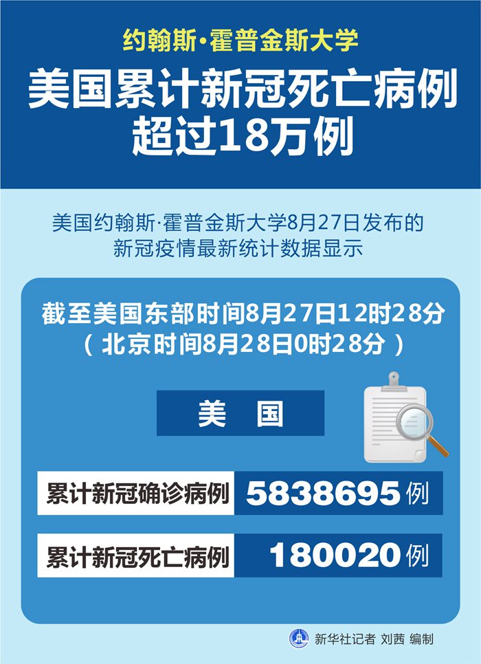 新華社紐約8月27日電 美國約翰斯·霍普金斯大學27日發(fā)布的新冠疫情最新統(tǒng)計數(shù)據(jù)顯示,截至美國東部時間27日12時28分(北京時間28日0時28分),美國累計新冠死亡病例180020例,累計確診病例5838695例。