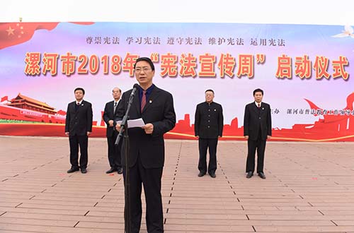劉尚進(jìn)在啟動(dòng)儀式上說,在全國(guó)上下認(rèn)真貫徹黨的十九大精神、深入學(xué)習(xí)宣傳和實(shí)施《中華人民共和國(guó)憲法》之際,我市開展“憲法宣傳周”活動(dòng),既是落實(shí)中宣部、司法部、全國(guó)普法辦關(guān)于開展憲法宣傳活動(dòng)有關(guān)精神的具體行動(dòng),也是掀起我市新一輪憲法宣傳教育熱潮的重要舉措。全市各級(jí)黨員干部要以高度的政治責(zé)任感,在學(xué)習(xí)宣傳憲法中發(fā)揮“頭雁”作用,嚴(yán)格依照憲法法律行使職權(quán)、履行職責(zé),以實(shí)際行動(dòng)推進(jìn)憲法實(shí)施。要切實(shí)落實(shí)好憲法宣誓制度,以領(lǐng)導(dǎo)干部“關(guān)鍵少數(shù)”為重點(diǎn),教育和引導(dǎo)國(guó)家工作人員忠于憲法、遵守憲法,切實(shí)維護(hù)憲法權(quán)威和尊嚴(yán)。要組織開展好面向各個(gè)層面的憲法宣傳教育活動(dòng),使每個(gè)人都成為憲法的忠實(shí)崇尚者、自覺遵守者、堅(jiān)定捍衛(wèi)者,奮力開創(chuàng)法治漯河建設(shè)新局面,為中原更加出彩增添濃彩提供堅(jiān)強(qiáng)的法治保障。