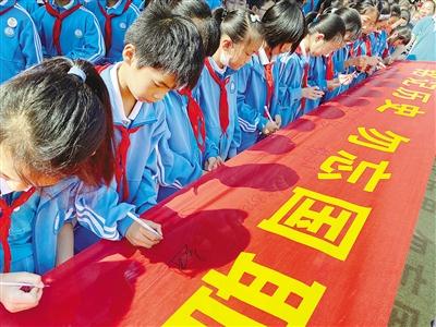 “九一八”來(lái)臨之際,萬(wàn)祥街小學(xué)組織全體師生開(kāi)展了以“銘記歷史 勿忘國(guó)恥 居安思危 強(qiáng)我中華”為主題的系列紀(jì)念活動(dòng)。圖為同學(xué)們?cè)跈M幅上簽名。朱亞如 攝