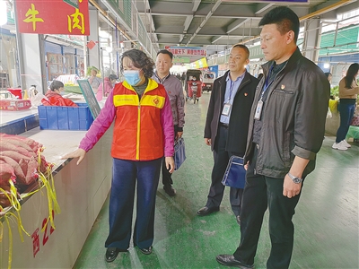 王斌(右)在溝張農(nóng)貿(mào)市場督導(dǎo)創(chuàng)文工作。