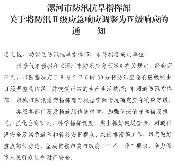 最新!漯河防汛應急響應等級調整!