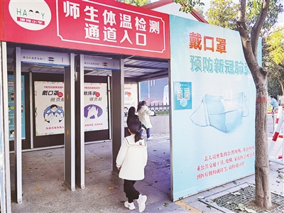 漯河小學(xué)門(mén)口,學(xué)生通過(guò)體溫檢測(cè)通道進(jìn)入校園。
