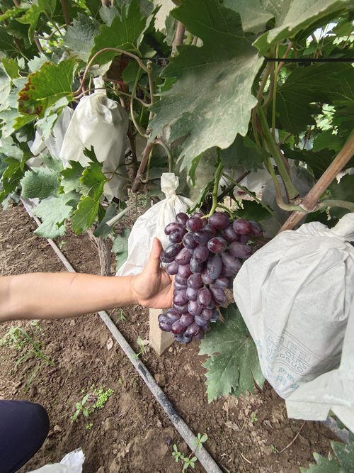 記者摘下幾顆“醉金香”葡萄品嘗,皮薄、甜度濃、飽滿多汁,口感香甜。記者發(fā)現(xiàn),有部分葡萄已經(jīng)熟透,出現(xiàn)掉果現(xiàn)象。