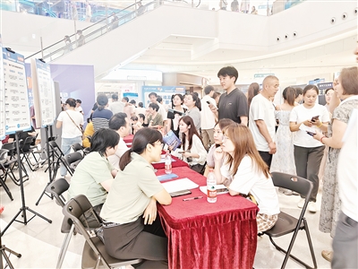 家長帶著孩子來了、年輕夫妻攜手來了、剛畢業(yè)的大學生來了……求職者及其同行者像逛街一樣,穿梭于各展位間,駐足詢問、投遞簡歷。