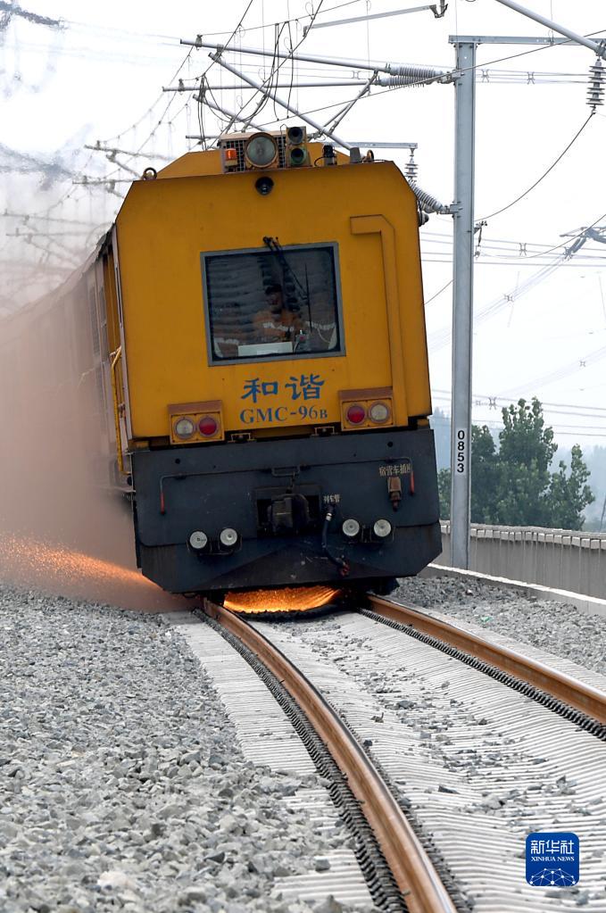 一輛鋼軌打磨車在鄭渝高鐵河南段的一處彎道作業(yè)(2019年7月18日攝)。