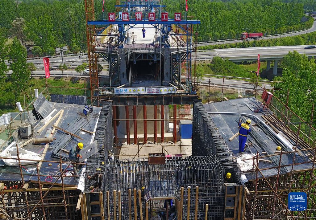 工作人員在鄭渝高鐵河南平頂山段一處施工現(xiàn)場(chǎng)作業(yè)(2017年4月29日攝)。